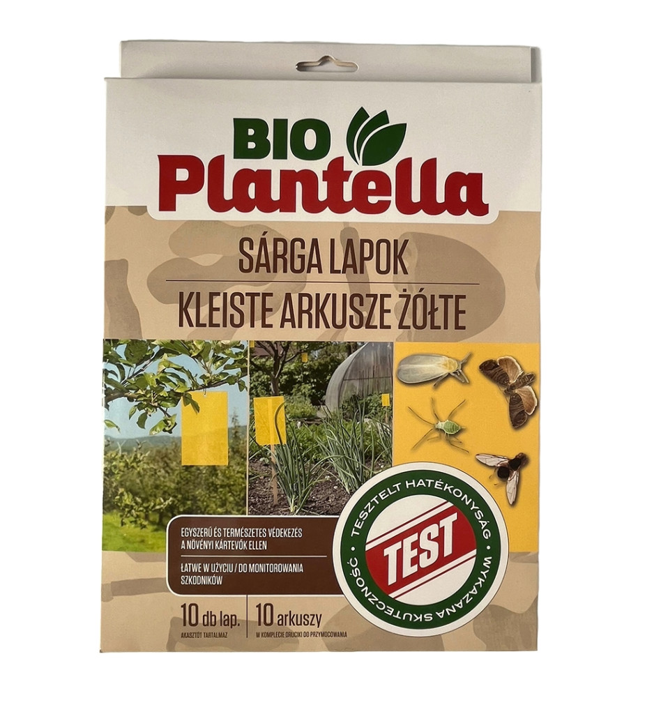 BIO Plantella sárga ragasztólap kiváló mechanikus és teljesen természetes védelmet nyújt a zöldséges és a gyümölcsös kertekben a legkülönfélébb kártevőkkel szemben. A ragadós lapok gondosan kiválasztott sárga árnyalata menthetetlenül csapdába csalja a kártevőket: a cseresznyelegyet, a különböző paránypilleféléket, az almamolyt, az olajbogyó-fúrólegyet, a szilvadarazsat és az egyéb kerti kártevőket, többek között a levéltetveket, az üvegházi molytetveket, a levélbogárféléket, a levélbolhákat, a rojtosszárnyúakat és a különböző legyeket, különösen a hagymalegyeket. Ha a kártevő megközelíti a lapot, ráragad a gyorsan ható rovartani ragasztórétegre. A doboz 10 db csapdát tartalmaz.