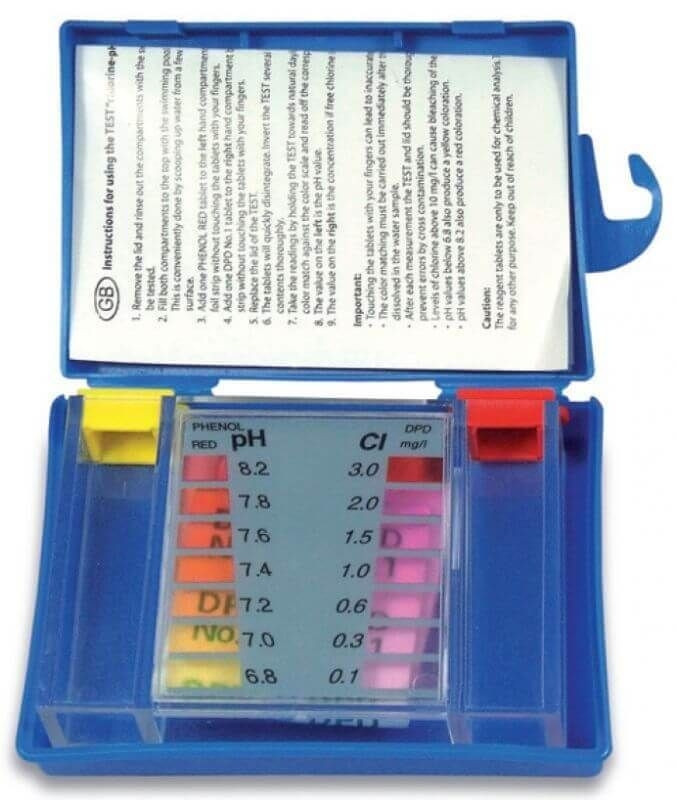 A készlet tartalma: 10 db tabletta a pH érték mérésére, 10 db tabletta a klór tartalom mérésére, kémcsövek, színskálák