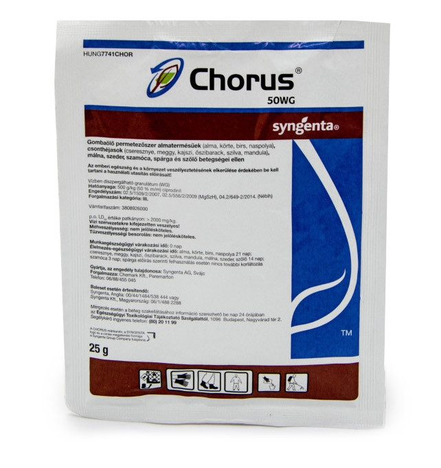 A Chorus-t kifejezetten a korai varasodásfertőzések ellen fejlesztették ki. Ez általában egérfül állapot és a virágzás időszakában, az aszkospóra-szóródás kezdetétől van. A Chorus szisztemikus készítmény (2 óra alatt felszívódik) és belülről véd, kuratív hatással rendelkezik. Egyedülálló tulajdonsága, hogy alacsony hőmérsékleten is hat, még fagypont közeli hőmérsékleten is alkalmazható. A Chorus-t egérfül állapottól sziromhullásig lehet kijuttatni 1–3 alkalommal. Lisztharmatra fogékony (pl. Jonathan) fajtában a Chorus-t egészítsük ki Thiovit Jet-tel.
