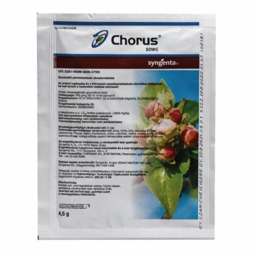 A Chorus-t kifejezetten a korai varasodásfertőzések ellen fejlesztették ki. Ez általában egérfül állapot és a virágzás időszakában, az aszkospóra-szóródás kezdetétől van. A Chorus szisztemikus készítmény (2 óra alatt felszívódik) és belülről véd, kuratív hatással rendelkezik. Egyedülálló tulajdonsága, hogy alacsony hőmérsékleten is hat, még fagypont közeli hőmérsékleten is alkalmazható. A Chorus-t egérfül állapottól sziromhullásig lehet kijuttatni 1–3 alkalommal. Lisztharmatra fogékony (pl. Jonathan) fajtában a Chorus-t egészítsük ki Thiovit Jet-tel.