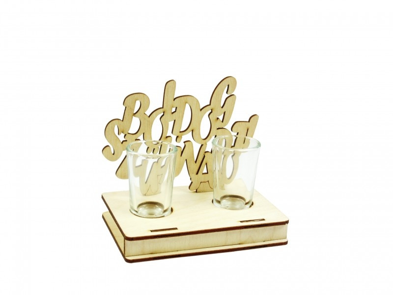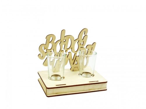 2db pálinkás pohár fa születésnapi tartóban.