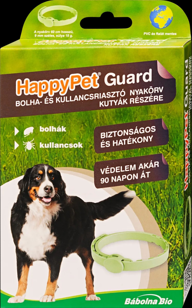 A HAPPY PET Bolha- és kullancsriasztó nyakörv kutyáknak természetes és hatékony megoldást nyújt a házi kedvenceknek a külső élősködőkkel szemben. A kutya testfelületén alkalmazva bolhák és kullancsok elriasztására alkalmas. A szintetikus neurotoxikus hatóanyagokkal ellentétben (pl.: fipronil) a geraniol olajon alapuló HappyPet18 Guard természetes forrásból származó hatóanyaga gátolja az élősködők légzését, valamint gyengítik vázukat, amivel az állathoz tapadnak. A HappyPet® Guard termékek 100%-osan biztonságosak az emberekre, az állatokra és azok környezetére.