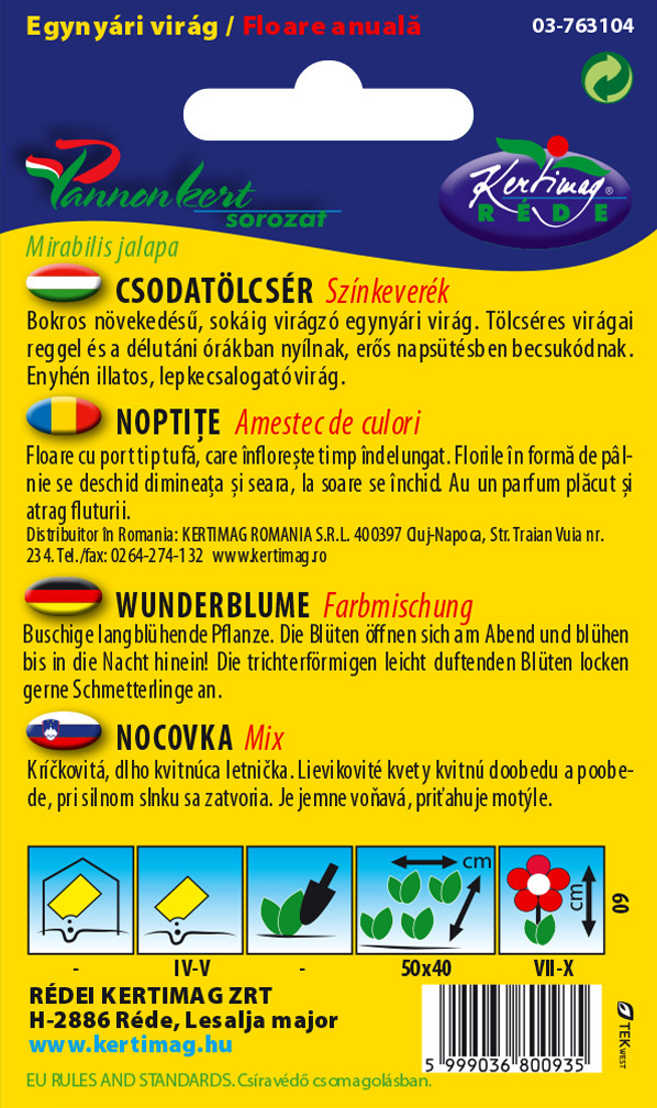 Félárnyékban is jól fejlődik. Sokszínű, enyhén illatos virágai a délutáni óráktól másnap délelőttig nyílnak. Kettő - három szem magot vetünk fészkenként. Közepes vízigényű. Virágágyi kiültetésen kívül térelválasztónak, cserjepótlónak, takarónövénynek is kiváló. 50-60 cm magas.
