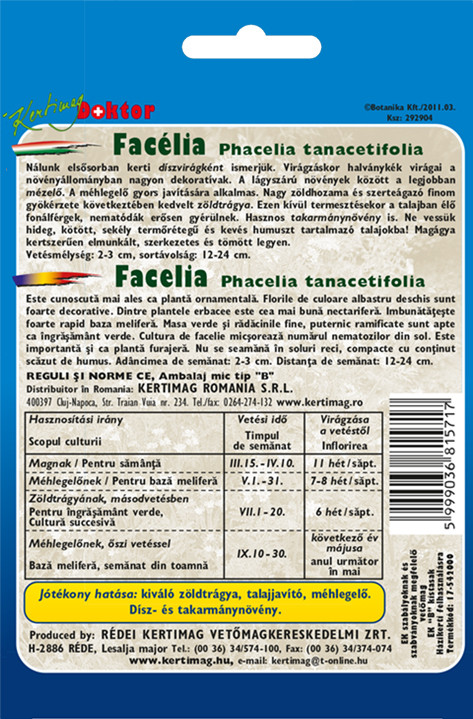Nálunk elsősorban kerti díszvirágként ismerjük. Virágzáskor halványkék virágai a növényállományban nagyon dekoratívak. A lágyszárú növények között a legjobban mézelő. A méhlegelő gyors javítására alkalmas. Nagy zöldhozama és szerteágazó finom gyökérzete következtében kedvelt zöldtrágya. Ezen kívül termesztésekor a talajban élő fonálférgek, nematódák erősen gyérülnek. Hasznos takarmánynövény is. Ne vessük hideg, kötött, sekély termőrétegű és kevés humuszt tartalmazó talajokba! Magágya kertszerűen elmunkált, szerkezetes és tömött legyen.