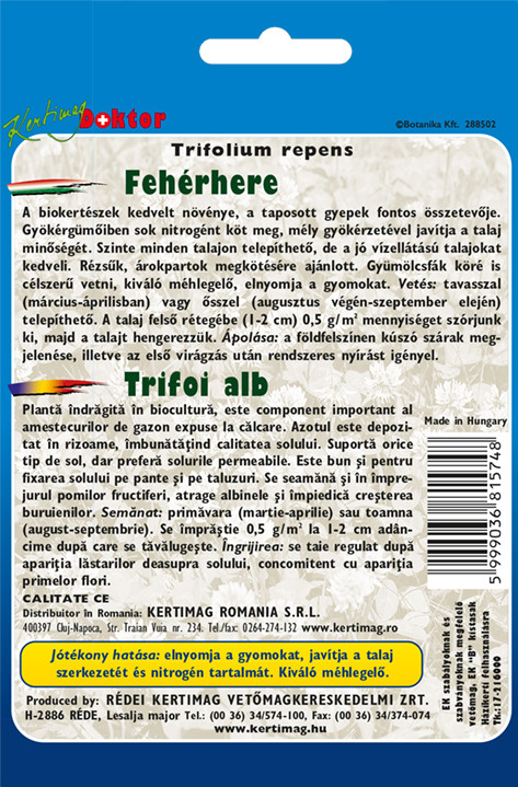 Kertdoktor Fehérhere 50g - Rédei Kertimag (Trifolium repens) a biokertészek kedvelt növénye. Gyökérgümőiben élő baktériumok sok nitrogént kötnek meg a levegőből. Mély gyökérzetével javítja a talaj minőségét. Kiváló méhlegelő és elnyomja a gyomokat. Kiváló rézsűk, gyümölcsösök és kaszálók füvesítésére, de pázsittal keverve is használható. Az első virágzás után rendszeres nyírást igényel. Szinte minden talajon telepíthető, de a jó vízellátású talajokat kedveli. A fehérhere vetőmag tökéletes választás, ha sűrű, strapabíró és alacsony fenntartású talajtakarót keresel! Gyorsan terjed, jól tűri a taposást, és természetes gyepalternatívaként is ideális. Nitrogénmegkötő képességének köszönhetően javítja a talaj minőségét, miközben vonzza a méheket és más beporzókat. Szárazságtűrő, kevés gondozást igényel, így fenntartható és környezetbarát megoldás kertedbe!