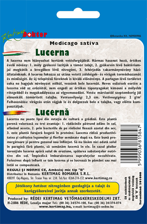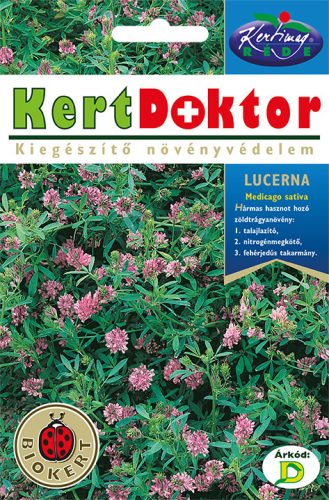Hármas hasznot hozó, értékes évelő növény: 1. mély gyökerei lazítják a tömör talajt, 2. gyökerein lévő baktériumai megkötik a levegőben lévő nitrogént, 3. fehérjedús takarmánynövény háziállatainknak. A lucerna fokozza az utána vetett zöldségek- és virágok terméshozamát és minőségét. Az új telepítésű füveknek is kiváló előnövénye. A parlagon lévő területet soha ne hagyjuk növényzet nélkül, vessünk bele lucernát. Heves esőzések esetén a lucerna véd az eróziótól, nem engedi az értékes tápanyagokat kimosni a mélyebb rétegekből és megakadályozza az elgyomosodást.