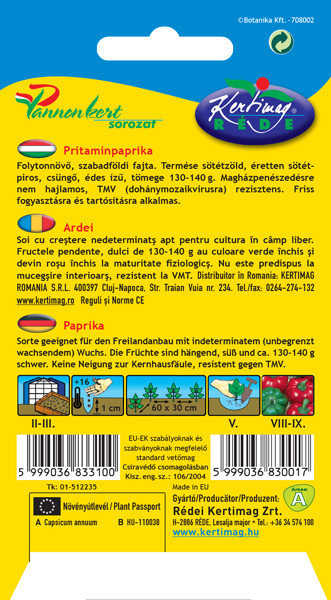 Folytonnövő, édes, sötétpirosra érő, paradicsomalakú fajta. Termése sötétzöld, éretten sötétpiros, csüngő, édes, tömege: 130-140g. Magházpenészedésre nem hajlamos. TMV (dohánymozaikvírus) rezisztens. Friss fogyasztásra és tartósításra is alkalmas.