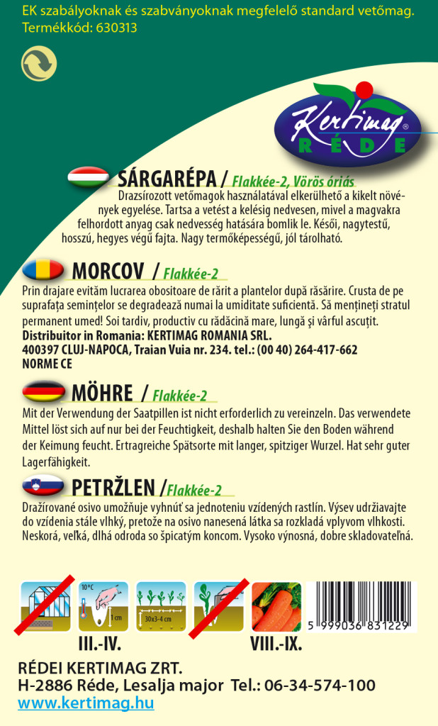 Drazsírozott vetőmag használatával elkerülhető a kikelt növények egyelése. Tartsa a vetést a kelésig nedvesen, mivel a magvakra felhordott anyag csak nedvesség hatására bomlik le. Késői, nagytestű, hosszú, hegyes végű fajta. Nagy termőképességű, jól tárolható.