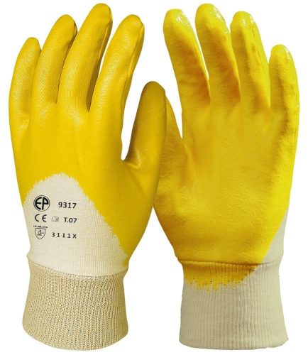 Pamutra ökölcsontig mártott sárga nitril kesztyű
