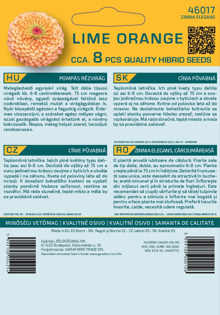 Melegkedvelő egynyári virág. Telt dália típusú virágaik kb. 6-8 centiméteresek. 75 cm magasra növő növény, egyedi szépségével feltűnő lesz csokrokban, remekül mutat a virágágyásban is. Nyár közepétől egészen a fagyokig virágzik. Érdemes visszacsípni, a sz