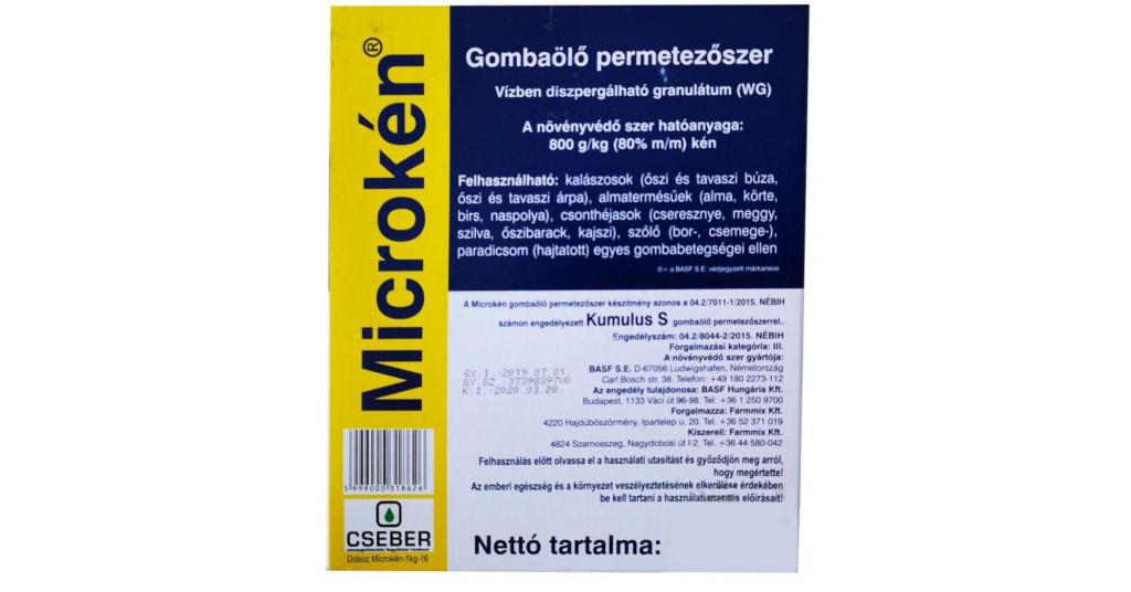 A Microkén azonos a Kumulus S , 02.5/767/1/2007 MgSZHK számon engedélyezett gombaölő permetezőszerrel.