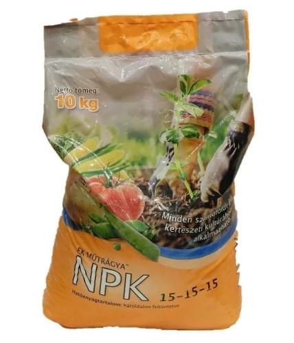 Hatóanyag tartalom: 15% Nitrogén, 15% P2O5, 15% K2O, 3% S, 4.5% CaO, 0.01% Zn