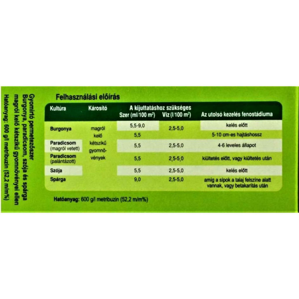 Élelmezés-egészségügyi várakozási idő: Burgonyában, paradicsomban és szójában rendeltetésszerű használat esetén nincs korlátozva.