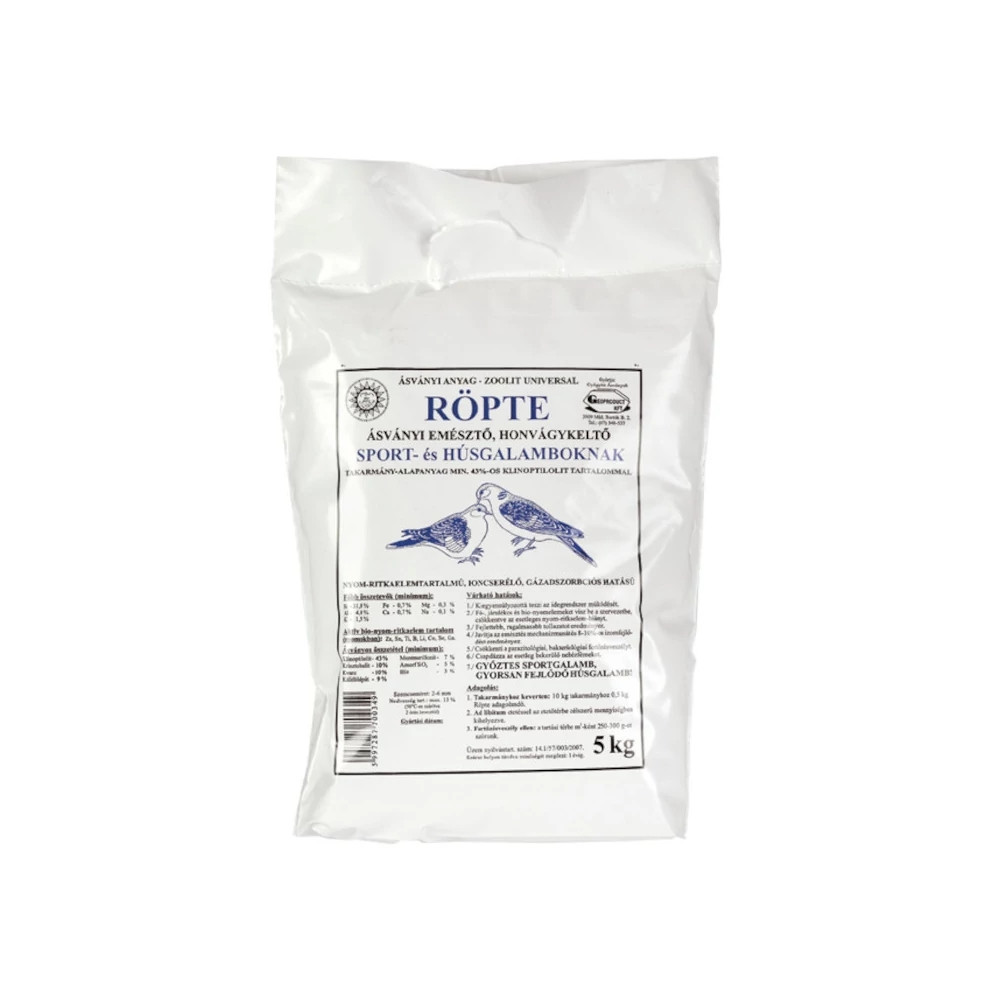A Röpte egy honvágykeltő ásványi emésztő sport- és húsgalambok számára, nyomelem, ritkaelem és minimum 20%-os klinoptilolit tartalommal, valamint ioncserélő és gázadszorbciós hatással. Az átlagos szemcsemérete 1-3mm, nedvességtartalma max. 17%.