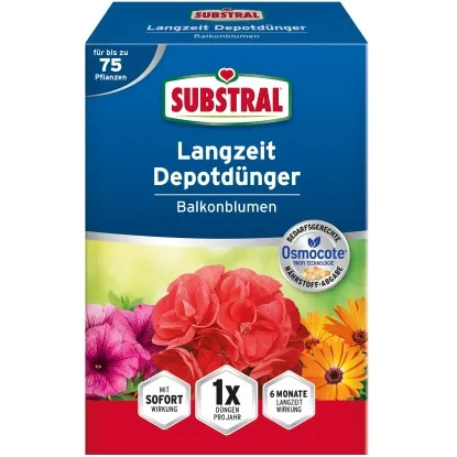 Substral Osmocote hosszú hatástartamú virágtrágya balkonnövényekhez 750 g. NPK(MgO) műtrágya 16-7-18(-4). Alacsony kloridtartalom. Évente egyszer műtrágyázni. Kettős hatás: azonnali és 6 hónapos hosszú távú. Alkalmazható: márciustól júliusig.