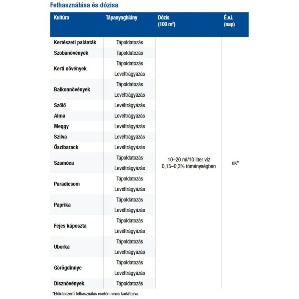 Zöldségtermesztésben hajtatásban tápoldatozásra 0,1–0,2 %-os (10-20 ml/10 l víz) töménységben, levéltrágyázásra önmagában vagy a növényvédő szeres kezelésekkel kombinálva 0,4%-os (40 ml/10 l víz) töménységben.
