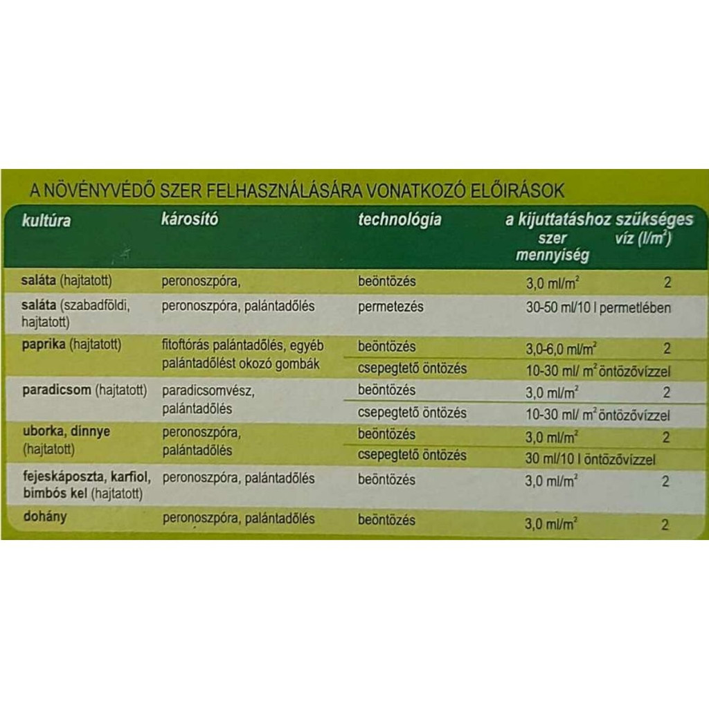 Permetezés: a szántóföldi saláta lombvédelmére a kezeléseket preventíven végezzük el, és 2-szer ismételjük 10 napos permetezési fordulóval 25ml/10l dózisban.